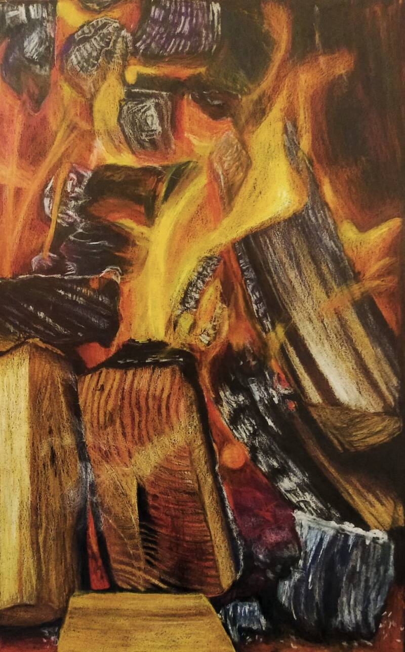 Kampvuur. Kleurpotlood op papier, 15x23 cm, 2025.